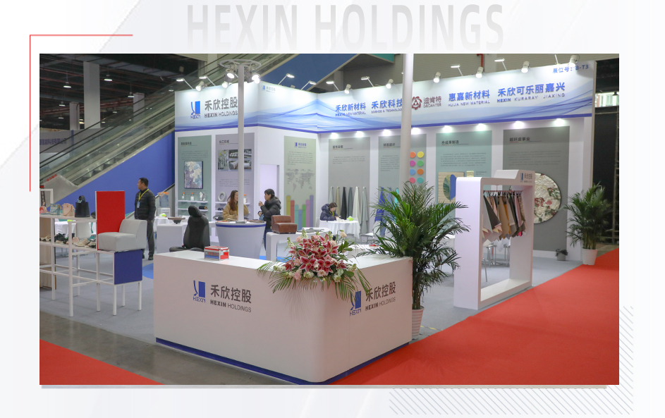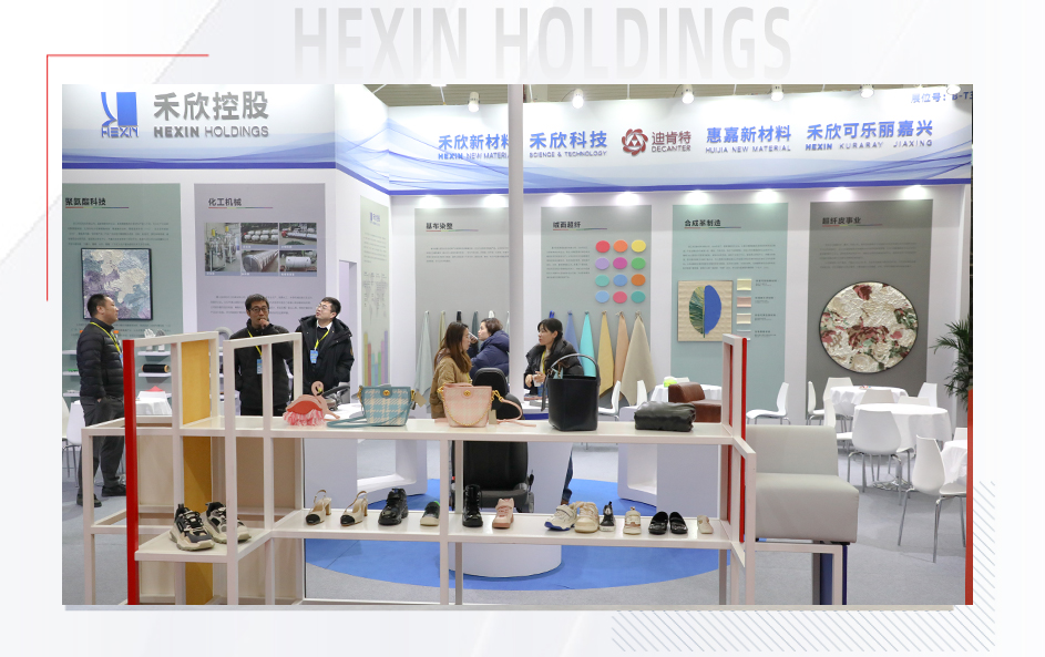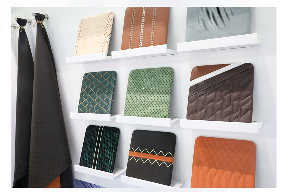 禾欣展臺B-T3位于會展中心中軸線,占據了展會C位。展臺以開放式布局體現開放、包容的展陳理念;藍、白主調輔以淺綠、淺灰、淺咖等淺色系,傳達出簡約、舒適的視覺效果。展板清晰展示了聚氨酯科技、化工機械、基布染整、絨面超纖、合成革、超纖皮等主營業務,令參觀者一目了然。三幅皮革畫作既傳達了綠色環保理念,也為展會增添藝術氣息。展品除了豐富的皮革掛樣外,成品展示區還陳列了汽車內飾、沙發、箱包、鞋靴、運動、電子包裝等的應用場景。