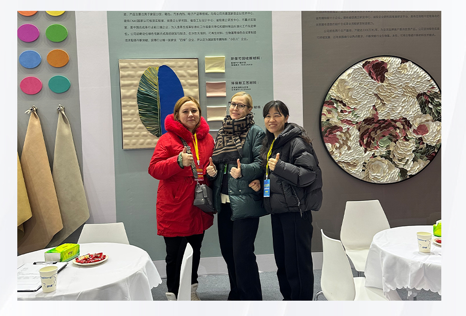 圍繞環保趨勢,禾欣科技推出了水性、無溶劑的綠色聚氨酯產品;合成革板塊則以敦煌系列、牛仔布紋系列、霧面雙色、鏡面革等風格化產品,展現新材料的無限可能;超纖板塊,禾欣可樂麗的多彩絨面、新品牛絨等奪人眼球,還通過汽車座椅、方向盤等場景,展現了超纖在車用領域的廣闊前景。三天展會,來自巴基斯坦、俄羅斯、尼泊爾、土耳其、烏茲別克斯坦等世界各地的客戶對產業鏈各類產品表現出深厚興趣;設計師們則尤其關注禾欣的明星產品,如云朵皮革和打孔超纖革的性能及應用場景。