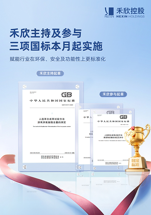 In April, three national standards led and participated by Hexin New Materials came into effect. These standards respectively address standardized testing for environmental sustainability, safety, and functionality in the synthetic leather industry. Among them, the national standard *Test Methods for Artificial Leather and Synthetic Leather—Determination of Free Isocyanate Content*, drafted under the leadership of Hexin New Materials, specifies three testing methods for isocyanate content and their corresponding detection limits, eliminating potential safety risks in products.